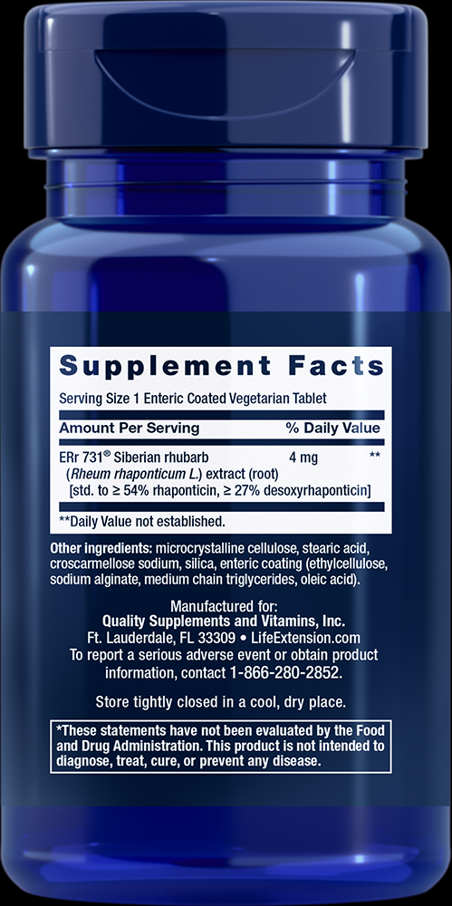 Product Info Serving Size: 1 Tablet Servings Per Container: 30 Amount Per Serving ERr 731® Siberian rhubarb (Rheum rhaponticum L.) extract (root) [std. to ] ≥ 54% rhaponticin, ≥ 27% desoxyrhaponticin] 4 mg